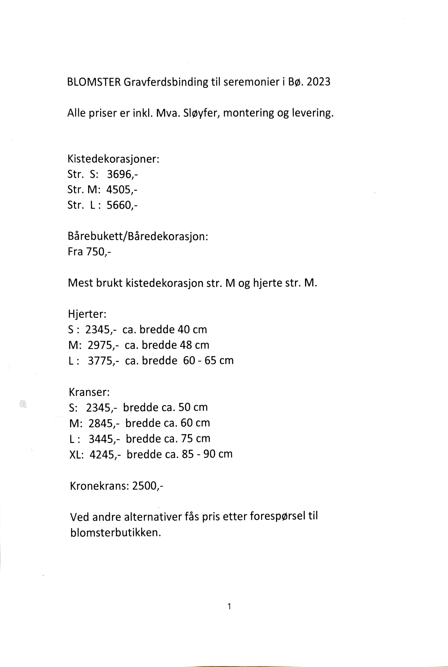 Du kan enkelt bestille blomster på via våre nettsider eller ved henvendelse til Bø Blomster på Steine eller Huldrehjørnet på Straume. Blomstene vil bli levert til seremonistedet begravelsesdagen. Det er tradisjon i Bø at prest eller gravferdskonsulenten leser opp alle sløyfetekstene. Det er selvsagt mulighet for at du selv leser opp din siste hilsen, da er det fint om du tar kontakt med oss når du kommer til seremonistedet for å avklare når det er tid for deg å lese.